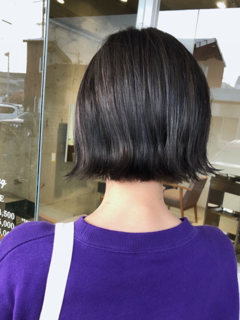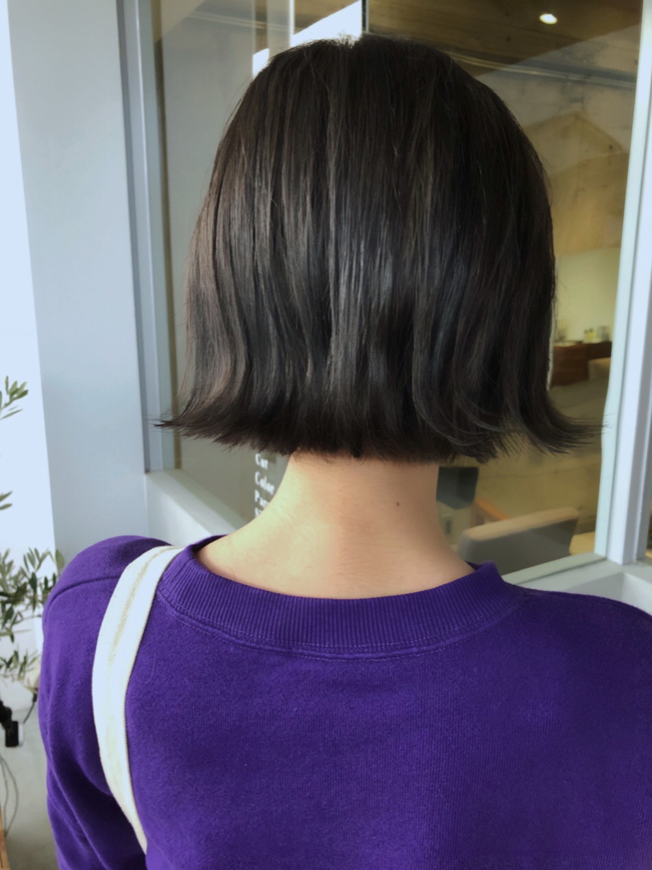 コンパクトなミニボブに暗めのカラーなのですがブルーブラックのローライトを入れてグレージュのカラーがしてあります♪