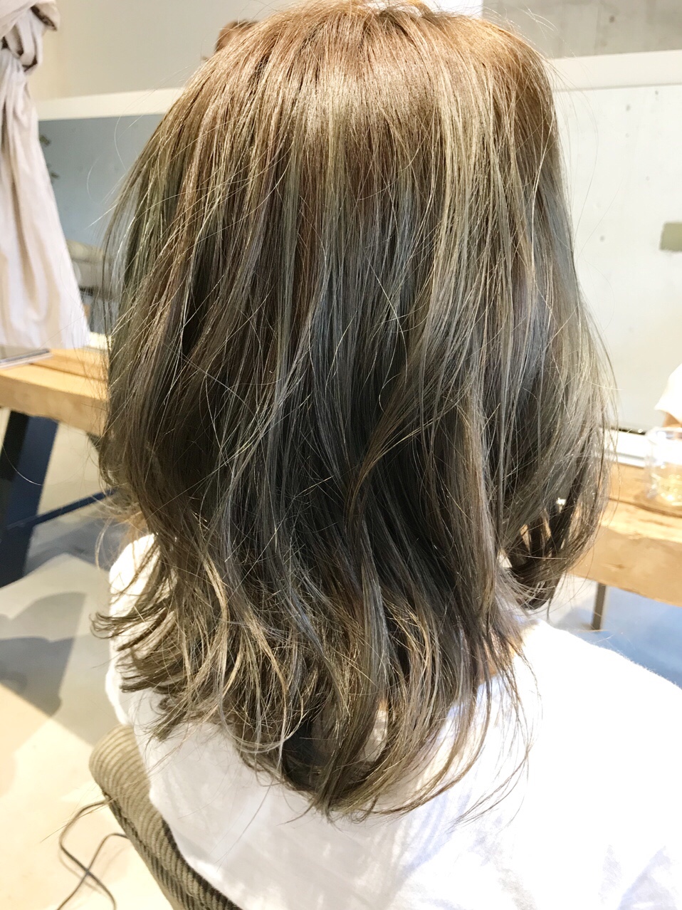 鎖骨ラインでカットし、多めのハイライトを入れたベースにマットベージュをプラスしました。